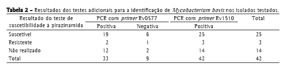 Entre 2005 e 2006, 8.121 espécimes clínicos enviados ao Laboratório de Micobactérias do Hospital Universitário Clementino Fraga Filho/Instituto de Doenças do Tórax, no Rio de Janeiro, RJ, foram inoculados em meio Löwenstein-Jensen contendo glicerol e piruvato. Desses espécimes, 79 isolados de micobactérias tiveram crescimento somente em meio com piruvato, sendo selecionados para a identificação presuntiva de Mycobacterium bovis. Esses isolados foram submetidos à identificação por testes bioquímicos, amplificação por PCR com primers específicos (Rv0577 e Rv1510) e teste de suscetibilidade à pirazinamida. Todas as cepas apresentaram padrões fenotípicos e genotípicos de M. tuberculosis, não sendo detectado M. bovis.