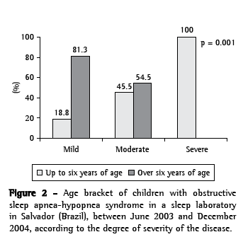 The fact that the most severe cases of OSAHS occur in preschoolers (under six years of age) is probably best explained by the higher occurrence of adenoid and tonsil hypertrophy (the principal causal factor of the obstructive sleep apnea syndrome in children) in this population, although other factors, such as pharyngeal muscle tone and genetic influences, can play a role. Marcus reported that the pathogenesis of the OSAHS is due to the combination of structural factors (adenoid and tonsil hypertrophy); craniofacial anomalies and neurological factors.(22) In each case one of these factors predominates. Valera et al. showed a greater tendency of OSAHS in preschoolers with the same degree of adenotonsillar obstruction, suggesting the influence of neurological and muscle maturation, as related by Ward and Marcus.(6,16)