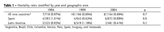 oito países da América Latina em 1994, 1999 e 2004. Resultados: Houve 25 mortes (0,8% de todos os pacientes hospitalizados) durante os