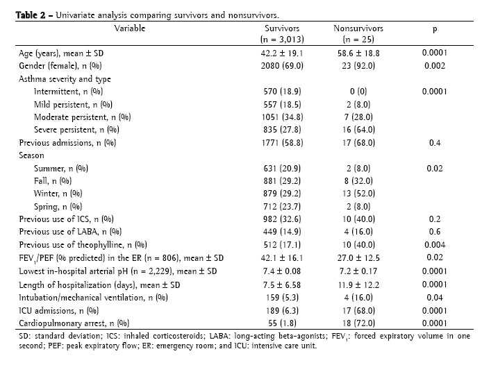 ResultsA total of 3,038 patients with asthma (37.5% aged 15-34 years, 32.5% aged 35-55 years, and 30% aged 56 years or older) were audited. Spain accounted for 56.4% of the total sample (nine large urban hospitals), and Latin America accounted for 43.6% (ten health facilities in eight countries).(15) At emergency room admission, 49.2% of the patients with asthma had severe exacerbations (baseline FEV1/PEF < 50% of predicted), 27.2% had life-threatening exacerbations (FEV1/PEF < 30% of predicted), and only 23.6% presented mild to moderate attacks (FEV1/PEF > 50% of predicted). However, this variable was recorded in only 806 cases (26.5% of all patients admitted). Overall, there were 25 deaths (0.8% of all hospitalized patients) during the three years studied. There were no significant differences in terms of year or geographic area (Table 1), although there was a tendency towards a reduction in in-hospital mortality (from 0.97% in 1994 to 0.69% in 2004). The occurrence of events such as ICU admission or cardiopulmonary arrest increased the mortality rates to 8.3% and 24.7%, respectively. In the univariate analysis (Table 2), we found pronounced differences between surviving and nonsurviving asthma patients. There was a relationship between mortality and age, since most asthma deaths occurred in patients over the age of 50 (68% vs. 12% in patients younger than 35 and 20% in patients aged 35-50). In addition, almost all deaths occurred in female patients. Nonsurviving asthma patients presented greater asthma severity, and there was a seasonal variation in the mortality rate among such patients (an excess of in-hospital deaths during winter months). Finally, the use of theophylline was significantly greater among nonsurviving asthma patients. It is of note that there was no difference between the groups in terms of the use of long-acting beta-agonists. Asthma attacks during hospitalization were more severe among nonsurviving asthma patients than among surviving asthma patients in terms of FEV1/PEF and arterial pH. In addition, nonsurviving asthma patients were hospitalized for longer periods, were more often submitted to intubation/mechanical ventilation, were more often admitted to the ICU, and more often suffered cardiopulmonary arrest.