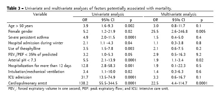 Among the patients who died during hospitalization, the mean interval between hospital admission and death was approximately 12 days. Deaths occurred more frequently among certain classes of patients: those > 50 years of age; those with severe persistent asthma; those hospitalized during the winter; those having previously used theophylline; those presenting more severe airway obstruction in the emergency room; those hospitalized for longer periods; those admitted to the ICU; and those submitted to intubation, mechanical ventilation, or both. However, the multivariate analysis showed that female gender and cardiopulmonary arrest were the only variables that were independently associated with a significantly increased mortality risk. Deaths occurred almost exclusively in female patients (92% of all deaths), and the mortality rate was quite high (24.7%) among patients suffering cardiopulmonary arrest. Arterial pH < 7.3 during hospitalization was also associated with an increased mortality risk.