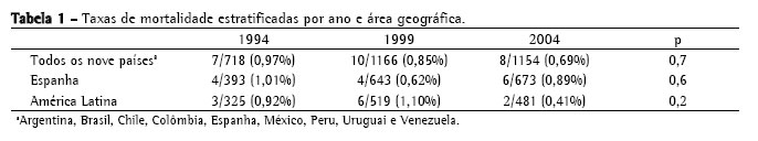 Um total de 3.038 pacientes com asma (37,5% com idade entre 15 e 34 anos, 32,5% com idade entre 35 e 55 anos e 30% com 56 anos ou mais) foi auditado. A Espanha foi responsável por 56,4% da amostra total (nove grandes hospitais urbanos), e a América Latina foi responsável por 43,6% (dez serviços de saúde de oito países).(15) No momento da internação no pronto-socorro, 49,2% dos pacientes com asma tinham exacerbações graves (VEF1/PFE basal < 50% do previsto), 27,2% tinham exacerbações com risco de morte (VEF1/PFE < 30% do previsto), e apenas 23,6% apresentavam crises leves a moderadas (VEF1/PFE > 50% do previsto). Entretanto, essa variável foi registrada em apenas 806 casos (26,5% de todos os pacientes internados). No total, houve 25 mortes (0.8% de todos os pacientes hospitalizados) durante os três anos estudados. Não houve diferenças significativas quanto ao ano ou à área geográfica (Tabela 1), embora tenha havido uma tendência de redução da mortalidade hospitalar (de 0.97% em 1994 para 0.69% em 2004). A ocorrência de eventos como internação em UTI ou parada cardiopulmonar aumentou as taxas de mortalidade para 8,3 e 24,7%, respectivamente. Na análise univariada (Tabela 2), encontramos diferenças significativas entre os pacientes asmáticos sobreviventes e os não sobreviventes. Houve relação entre mortalidade e idade, haja vista que a maioria das mortes por asma ocorreu em pacientes com mais de 50 anos (68 vs. 12% em pacientes com menos de 35 anos e 20% em pacientes com idade entre 35 e 50). Além disso, quase todas as mortes ocorreram em pacientes do sexo feminino. Os pacientes asmáticos não sobreviventes apresentaram asma de maior gravidade, e houve variação sazonal da taxa de mortalidade entre esses pacientes (um excesso de mortes hospitalares durante os meses de inverno). Por fim, o uso de teofilina foi significativamente maior entre os pacientes asmáticos não sobreviventes. Vale ressaltar que não houve diferença entre os grupos quanto ao uso de beta-agonistas de ação prolongada. Em relação ao VEF1/FEP e ao pH arterial, as crises de asma durante a hospitalização foram mais graves entre os pacientes asmáticos não sobreviventes do que entre os sobreviventes. Além disso, os pacientes asmáticos não sobreviventes foram hospitalizados por períodos mais longos, foram submetidos a intubação/ventilação mecânica com maior freqüência, foram internados em UTI com maior freqüência e sofreram parada cardiopulmonar com maior freqüência.