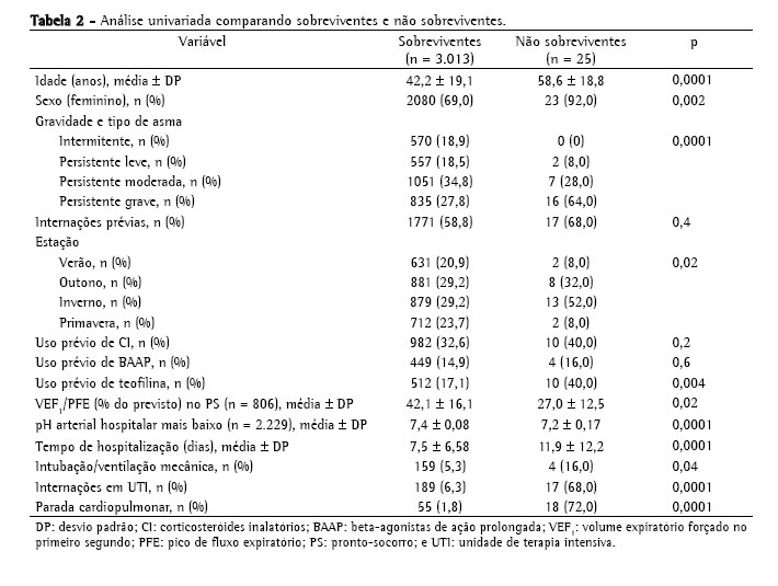 Todos os dados foram analisados utilizando-se o software Statistical Package for the Social Sciences, versão 12.0 para Windows (SPSS Inc., Chicago, IL, EUA). Os dados são apresentados como média ± desvio padrão para as variáveis contínuas. O desfecho principal foi mortalidade por asma. Os sujeitos foram divididos em dois grupos: os que morreram durante a hospitalização e os que receberam alta (controles). As variáveis contínuas com distribuição normal foram comparadas utilizando-se o teste t para amostras independentes, e as variáveis contínuas sem distribuição normal foram comparadas utilizando-se o teste U de Mann-Whitney As variáveis categóricas foram comparadas utilizando-se o teste do qui-quadrado com correção de Yates ou o teste exato de Fisher. Os fatores associados à mortalidade por asma em nível de significância de p = 0,05 na análise univariada foram selecionados para inclusão em uma análise multivariada (regressão logística múltipla). Valores de p < 0,05, utilizando-se teste bicaudal, foram considerados significativos para todos os testes estatísticos. Intervalos de confiança de 95% (IC95%) foram calculados utilizando-se fórmulas padronizadas.(17)