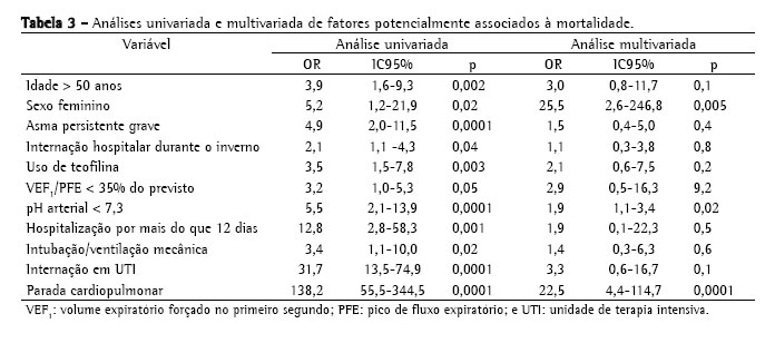 As variáveis significativamente associadas à mortalidade por asma durante a hospitalização foram incluídas em uma análise multivariada (Tabela 3). Após o ajuste para os outros preditores do modelo, descobrimos que três variáveis estavam associadas à mortalidade por asma. Duas dessas variáveis apresentaram associação particularmente forte com a mortalidade por asma, aumentando de forma independente a probabilidade de morte durante a hospitalização: sexo (feminino; OR = 25,5; IC95%: 2,6-246,8) e parada cardiopulmonar (OR = 22,5; IC95%: 4,4-114,7). Uma terceira variável, pH arterial < 7,3 durante a hospitalização (OR = 1,9; IC95%: 1,1-3,4), também estava associada a aumento significativo da mortalidade por asma.