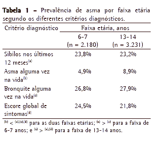 A prevalência de asma foi superior a 20% nas duas faixas etárias quando consideramos o diagnóstico pelo escore global do ISAAC, pela presença de sibilos nos últimos 12 meses e pelo diagnóstico médico de bronquite.