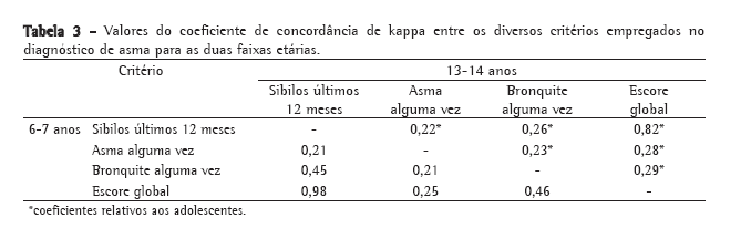Na Tabela 3, estão apresentados os coeficientes de concordância de kappa entre os vários critérios diagnósticos empregados para as duas faixas etárias. Observamos níveis excelentes de concordância entre os critérios "sibilos nos últimos 12 meses" e "escore global de asma" para as duas faixas etárias. Para as demais comparações, foram encontrados níveis fracos de concordância.