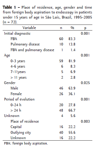 This difference was statistically significant (p < 0.001). As can be seen in Table 1, the following factors were also relevant: age under three years (in 81.9%; p < 0.001); male gender (in 63.9%; p = 0.025); > 24 h elapsed between the episode of aspiration and the definite diagnosis (in 66.7%; p < 0.001); and residence in outlying city (in 55.6%; p = 0.003). The signs and symptoms most frequently observed were dyspnea, cough and diffuse crackles (in 77.8%, 61.1% and 43.5%, respectively; data not shown in tables).
