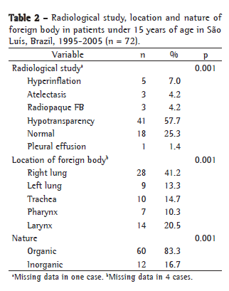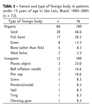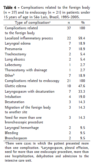 We found the principal complications attributed to the presence of foreign bodies to be related to their location (lung, trachea and larynx), nature (predominantly organic) and duration at the site. The localized inflammatory process can be explained by the fact that the predominant locations of the foreign bodies were the lung and trachea, whereas the ­laryngeal edema could be explained by the aspiration of fish bones and their location in the larynx.(1,2,10,21)