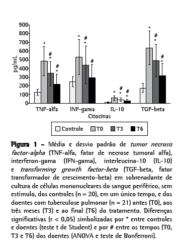 O TNF-α é outra citocina participante da formação do granuloma, com níveis elevados no líquido pleural, no plasma ou em cultura de monócitos de pacientes com tuberculose, antes ou após o início do tratamento, quando comparados com os pacientes crônicos ou indivíduos normais. Esses relatos sugerem que o TNF-α é necessário no início do processo inflamatório para limitar a multiplicação da micobactéria.(18,19,26) Outros estudos mostraram que os níveis iniciais elevados de TNF-α na TBP diminuíam significativamente ao longo do tratamento, ao mesmo tempo em que involuía o processo inflamatório.(14,26) No presente estudo, a produção de TNF-α pelos monócitos dos pacientes, estimulados ou não, também foi maior do que a dos controles antes do início, aos três meses e ao final do tratamento. Apesar de sempre maior que a dos normais, a produção da citocina diminuiu significativamente ao longo do tratamento, sendo os níveis finais menores que os iniciais. Esses níveis pós-tratamento mais altos do que os normais, também encontrados em outro estudo, sugerem que o TNF-α tem função protetora, além do importante papel na imunopatogenia da doença.(20)