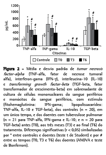 Outros autores não encontraram diferença entre os níveis séricos de TGF-β dos doentes e dos grupos controles.(26) Sem verificarem efeito relevante do tratamento sobre os níveis desta citocina, sugeriram que a ação do TGF-β depende da sua concentração. As diferenças encontradas no comportamento de TGF-β na tuberculose, em estudos de estimulação in vitro de células, podem ser atribuídas às técnicas de isolamento e de cultura utilizadas, que nem sempre são as mesmas.(26)