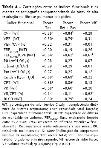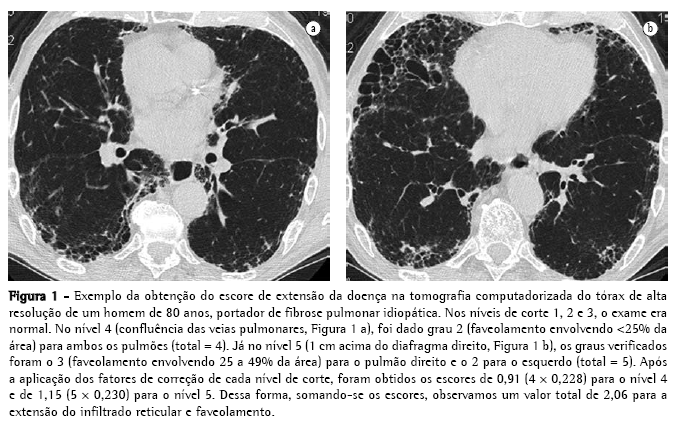 Outro método radiológico utilizado para correlação com a função pulmonar é a tomografia computadorizada do tórax de alta resolução (TCAR). Desde o seu surgimento, ela foi reconhecida como ferramenta importante na avaliação da FPI e, hoje, é considerada o melhor método para avaliar a extensão do acometimento pulmonar.(5) Isto estimulou a realização de estudos com o intuito de avaliar a correlação entre a extensão da doença intersticial e as anormalidades funcionais. Entretanto, devido à inclusão de portadores de doenças ocupacionais e do tecido conjuntivo, bem como de indivíduos fumantes e ex-fumantes nestas amostras, houve grande variabilidade nos resultados.(6-10) Alguns destes trabalhos e consensos internacionais enfatizam a marcante influência do enfisema na interpretação dos testes de função pulmonar, ressaltando sua interferência no estudo das correlações.(1,6,7)