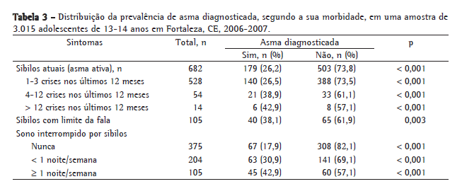 A questão sobre "sibilos com limite da fala" aponta para a asma aguda grave, sendo de relevância direta em comparações internacionais sobre admissões hospitalares e estatísticas de mortalidade.(6) No Brasil, a prevalência de respostas positivas a essa questão variou de 2,6% a 9,1% entre os adolescentes. Os dados de Fortaleza estão muito próximos aos obtidos em Curitiba, PR (3,1%); Nova Iguaçu, RJ (3,3%); e Santa Maria, RS (3,8%).(11)