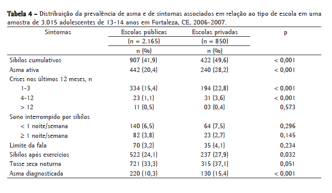 Em relação às prevalências por tipo de escola - pública ou particular - observou-se uma predominância entre os adolescentes dessa última, com significância estatística, de sibilos cumulativos (p < 0,001), asma ativa (p < 0,001), "1-3 crises de sibilos nos últimos 12 meses" (p < 0,001), "4-12 crises de sibilos nos últimos 12 meses" (p < 0,001), asma diagnosticada (p < 0,001) e "sibilos após exercícios" (p = 0,032). Não houve diferenças entre os dois grupos, com significância estatística, para "sono interrompido por sibilos" e nem para os sintomas relacionados à gravidade da asma (Tabela 4).