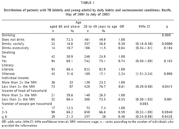 The present study intends to describe the demographic characteristics, socio-economic conditions and daily habits, as well as the clinical/epidemiological profiles and access to health care facilities, of a group of elderly patients with TB, comparing them with those of young adults treated in Recife during the same period. The knowledge obtained will contribute to the delineation of new strategies of TB control among the elderly.