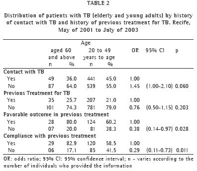 A lower percentage of elderly individuals reported having had contact with TB, whereas the two groups presented a history of previous treatment for TB with similar frequency. The elderly reported greater treatment compliance (completing the treatment) and a higher percentage of cure in the most recent treatment (Table 2). The period of time from the onset of symptoms until the implementation of the current treatment was similar between the groups (Table 3).