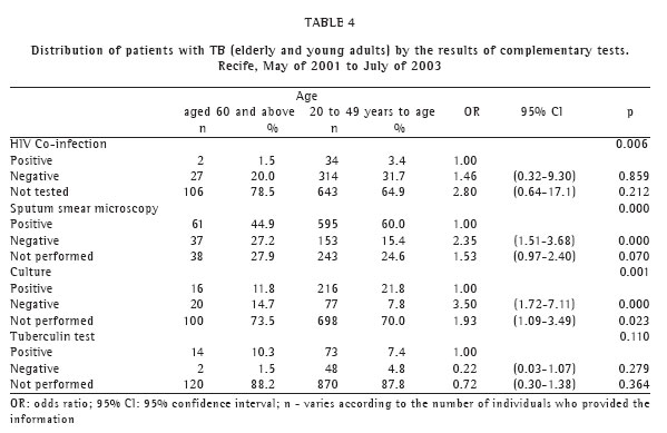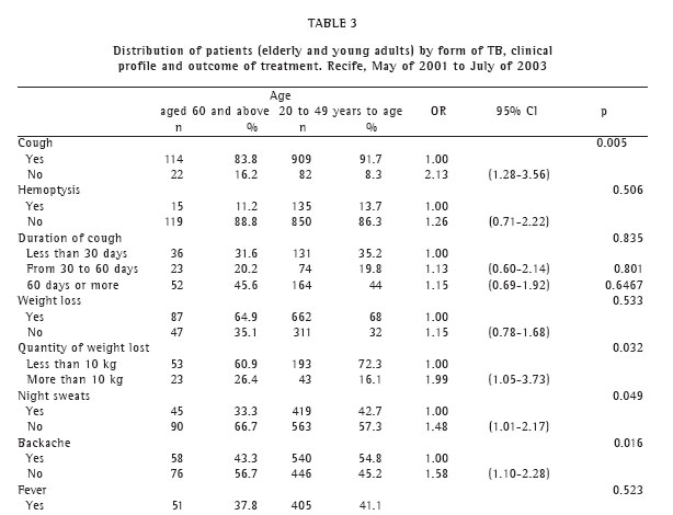 We found that, in Recife, when elderly individuals with TB are compared to young adults with TB, the elderly presented less alcoholism; higher rates of illiteracy; higher income as the head of the household; greater previous adherence to treatment; lower frequency of cough and backache; more accentuated weight loss; and lower frequency of positivity in sputum smear tests for Koch's bacillus. Regarding the outcome of the treatment, neither death nor cure was associated with being elderly (Table 5).