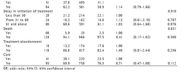 No statistically significant association was observed in the univariate analysis between being an elderly individual with TB and presenting any of the outcomes herein: death, noncompliance or cure (Table 3). When the favorable outcomes (hospital discharge after cure or completion of the treatment program) and unfavorable outcomes (death, noncompliance with treatment or failure of treatment) were grouped, no statistically significant difference was found (p = 0.831). Outcomes were favorable in 76.9% of the cases (93) and in 75.5% of the controls (675), whereas they were unfavorable in 23.1% (28) and 24.5% (219), respectively.