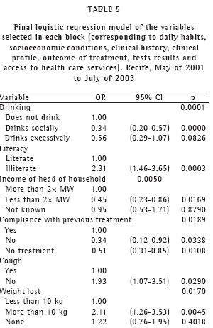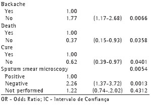 After the multivariate analysis, the variables that remained in the final model were the following: drinking (p = 0.0001); literacy (p = 0.0003); income of the head of the household (p = 0.0050); previous compliance with treatment (p = 0.0189); cough (p = 0.0290); body weight (p = 0.0170); backache (p = 0.0066); death (p = 0.0358); cure (p = 0.0401); and sputum smear microscopy result (p = 0.0054) (Table 5).