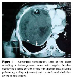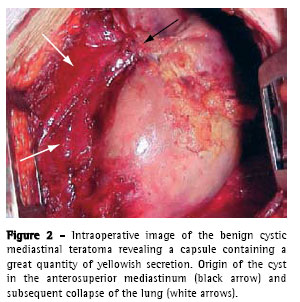 We discuss this case placing emphasis on the atypical presentation of the benign cystic mediastinal teratoma, which mimicked pleural empyema, while remaining attentive to the possibility of enhanced tumor growth, which hinders the defini-tive pre-operative diagnosis. In reviewing the literature, we observed that most physicians make an initial diagnosis of pleural empyema when faced with a benign cystic mediastinal teratoma of considerable volume. Although such misdiagnosis is understandable due to the similarity of the clinical and radiological characteristics, it delays the diagnosis and makes the treatment more expensive. Therefore, we realize the importance of suspecting this disease in a patient presenting a large, well-defined opacification of one hemithorax and having no history of pulmonary infection or any other condition that might predispose to pleural empyema. Surgery should be performed in order to clarify the diagnosis or whenever complications such as pulmonary atelectasis, adhesion to/compression of adjacent structures, and malignant transformation are probable. The results after surgical resection are excellent.(1,2,6) Radiotherapy can be used to prevent local recidivism when it is not possible to fully excise the cyst.(6)
