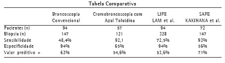 INTRODUÇÃO: Os autores relatam a experiência em uma série de pacientes submetidos a cromobroncoscopia com azul de toluidina com a intenção de detectar lesão pré-neoplasica em via aérea inferior central. OBJETIVOS: Analisar a especificidade e sensibilidade do método para diagnóstico precoce de lesão pré-neoplásica e neoplásica. MÉTODO: TARKKANEN et al. (1972) foram os primeiros a utilizarem o corante vital na via aérea para lesões neoplásicas. A broncofibroscopia foi realizada, com aprovação da comissão de ética médica, em 57 pacientes, com 121 biópsias, e em cada local da via aérea, corado ou padronizado, foram colhidas no mínimo, duas amostras de mucosa brônquica. Os critérios de inclusão foram pacientes com mais de 40 anos de idade, fumantes, de ambos os sexos, cirurgia de câncer de pulmão no passado, história de câncer na via aero-digestiva, pacientes em estadiamento de carcinoma de esôfago ou pulmão, fumantes com tosse e/ou hemoptise sem causa aparente, e pacientes com citologia de escarro positiva. Método estatístico empregado: 1 - Teste de MANN-WHITNEY (SIEGEL et al., 1988) para comparar os pacientes com áreas coradas com aqueles com áreas não-coradas em relação à idade, cigarros/dia, anos de tabagismo e anos/maço; 2 - Teste de Sensibilidade/ Especificidade (GALLEN et al., 1975) para confrontar biópsias com o corante. Fixou-se em 0,05 ou 5% ( < 0,05) o nível de rejeição da hipótese de nulidade. RESULTADOS: Participaram do estudo 57 pacientes, 11 mulheres (19,3%) e 46 homens (80,7%). A média do grupo foi de 61 anos, 25 cigarros/dia, 40 anos de tabagismo e 50 anos/maço. Foram realizadas 121 biópsias, em média 2 a 3 fragmentos de cada local. Nessa casuística houve 3 portadores de neoplasia de laringe e 4 com neoplasia de esôfago, dos quais, em nenhuma oportunidade observou-se sincronicidade com lesões pré-neoplásicas e/ou câncer de pulmão. A sensibilidade foi de 92,1%; especificidade 65.0%; taxa de erro falso-positivo 34,93%; taxa de erro falso-negativo 7,89%; valor preditivo positivo 54,6%; valor preditivo negativo 94,7%. CONCLUSÕES: A cromobroncoscopia é um exame de baixo custo de fácil execução por qualquer broncoscopista, com uma sensibilidade de 92,1% e uma especificidade 65%, para as lesões de mucosa secundárias ao tabagismo e um valor preditivo negativo de 94,7%. Neste estudo não apresentou morbidade nem mortalidade. Estes números colocam a cromoscopia como um bom método de rastreamento de lesões precoces centrais, comparáveis aos já conceituados métodos, LIFE, SAFE.