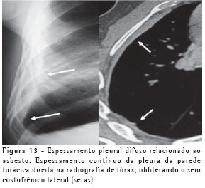 Espessamento pleural difusoO espessamento pleural difuso resulta de espessamento e fibrose da pleura visceral, com posterior fusão com a pleura parietal. Na radiografia é definido como espessamento contínuo da pleura parietal, estendendo-se por no mínimo um quarto da parede torácica, geralmente com obliteração do seio costofrênico. O espessamento pleural difuso é diagnosticado na TC quando o espessamento pleural se estende por no mínimo 8 cm no sentido longitudinal, 5 cm na largura e 3 mm na espessura (Figura 13).(12)