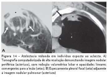 AsbestoseA fibrose intersticial pulmonar difusa como conseqüência da inalação de fibras de asbesto é conhecida como asbestose. As alterações do parênquima pulmonar têm início nas regiões peribronquiolares, com evolução para as paredes dos alvéolos, septos interlobulares e regiões subpleurais, predominando nos campos pulmonares póstero-inferiores, de modo geralmente simétrico.(16-17)