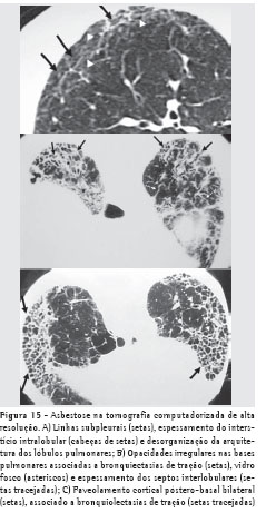 O melhor método de imagem é a TCAR. Além de aumentar a detecção das formas iniciais da doença, onde a radiografia é quase sempre normal, a TCAR permite a diferenciação da asbestose de outras alterações parenquimatosas, e redução do número de casos falso positivos e da variabilidade interobservador. Um estudo demonstrou que a TCAR revela alterações em 80% dos pacientes com radiografia normal e evidências clínicas de asbestose e em 30% daqueles sem evidências clínicas ou radiográficas. Atualmente, a maioria dos autores recomenda a TCAR em todo indivíduo com história de exposição ao asbesto e radiografia simples do tórax alterada. As principais alterações na TCAR são opacidades e linhas subpleurais, vidro fosco, espessamento dos septos interlobulares, faveolamento, distorção arquitetural e bronquiectasias de tração (Figura 15).(7)