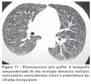 ASPECTOS DE IMAGEM DE OUTRAS DOENÇAS RESPIRATÓRIAS AMBIENTAIS E OCUPACIONAISAlém da sílica e do asbesto, outros agentes podem ser causadores de doenças respiratórias ambientais e ocupacionais. Na pneumoconiose pelo grafite, os achados tomográficos mais comuns são micronódulos pulmonares, espessamentos septais e opacidades parenquimatosas (Figura 17).(23)