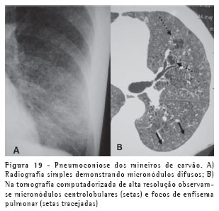 A pneumoconiose dos mineiros de carvão (Figura 19) assemelha-se muito à silicose, sendo praticamente impossível diferenciá-las apenas com os achados de imagem, apesar de os nódulos silicóticos geralmente serem maiores.