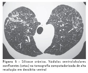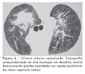A TCAR é um método mais sensível e específico do que a radiografia simples para a detecção e caracterização da silicose. Permite melhor definição do tipo e da extensão das alterações, especialmente do enfisema centrolobular que pode estar presente nestes indivíduos e que é dificilmente demonstrado pela radiografia, a não ser nos casos mais acentuados. A concordância inter e intraobservador na avaliação das alterações respiratórias decorrentes da silicose é maior com a TCAR do que com a radiografia e a correlação com a função pulmonar é mais fidedigna com a TCAR. Em um estudo realizado num grupo exposto à sílica com radiografias normais, a TC estava alterada em 41% dos casos, sendo que em 10% as alterações eram visíveis apenas com a TCAR.(4) Nos indivíduos com radiografias alteradas, neste mesmo grupo, a TCAR permitiu melhor caracterização dos achados. Por estes motivos, segundo alguns autores, a TC deve ser realizada sistematicamente naqueles indivíduos expostos com suspeita de silicose na radiografia simples de tórax.