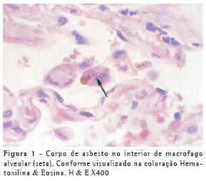 CA, por outro lado, são facilmente visíveis ao microscópio óptico (Figura 1), sendo marcadores específicos de asbesto na maioria da população.(11) O método mais simples, rápido e menos dispendioso, mas também menos quantificável de determinar asbesto no pulmão é o achado ou contagem do número de CA nos cortes histológicos.