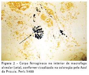 Pelo pequeno volume de tecido contido num corte histológico de rotina, em geral 5 microns, os preparados histológicos são muito insensíveis detectores de CA. Todavia, adotamos o mesmo critério proposto por Roggli e Pratt,(13) ou seja, conhecido o nível de exposição ao asbesto da população em questão (não devem ser encontrados após se examinar de 1 a 100 cortes), a observação de um CA em um corte de 5 microns usualmente indica exposição ocupacional. Para tanto, o patologista deverá rastrear a procura em 50 campos de grande aumento, utilizando para isso aprofundamento dos cortes. Como os CA não são facilmente visualizados nos cortes corados por hematoxilina e eosina, colorações para ferro devem ser utilizadas, para facilitar ao patologista sua identificação (Figuras 1 e 2). A contagem definitiva deverá ser efetuada por microscopia eletrônica, após digestão enzimática dos cortes de pulmão. Esta técnica pode ser realizada mesmo após a inclusão do tecido pulmonar em blocos de parafina. Os índices numéricos finais deverão então ser comparados a índices da população exposta em geral, e expressos através de alta ou baixa exposição.(12) No Quadro 1 podem ser apreciados alguns valores.(12,14)