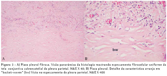 Placas pleuraisAs placas pleurais, ao mesmo tempo em que são os marcadores mais comuns de exposição ao asbesto,(16) constituem-se em doenças relacionadas ao asbesto. Todas as fibras de asbesto têm igual capacidade de induzir placas pleurais, porém a extensão das placas não apresenta relação clara com exposição cumulativa. À macroscopia são lesões circunscritas, levemente sobrelevadas, esbranquiçadas, irregulares, encontradas na pleura parietal e, raramente, na pleura visceral.(11) Podem ser pequenas ou extensas, e estão comumente localizadas nos segmentos laterais e posteriores das zonas médias dos pulmões, onde então acompanham o contorno das costelas e do diafragma. Geralmente elas acompanham as fissuras lobares e podem invadir o mediastino e o pericárdio, raramente, porém, comprometendo os ápices ou sulco costofrênico. Histologicamente, placas pleurais associadas ao asbesto são caracterizadas por lesões pouco celulares, com extensa colagenização através de fibras em característico arranjo em basket-waven, delimitadas por fino revestimento de células mesoteliais (Figura 3). O envolvimento da pleura parietal é uniforme, com mínimo espessamento da pleura visceral, não havendo, porém, adesões entre os dois folhetos.