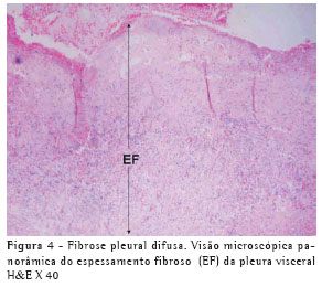Espessamento difuso é freqüentemente visualizado como uma tela de 5 a 10 cm de extensão craniocaudal, afetando, em 90% dos casos, o seio costofrênico e as fissuras interlobares e interlobulares. Enquanto as placas pleurais fibrosas comprometem a pleura parietal, o espessamento fibroso é uma doença da pleura visceral (Figura 4), que pode ocorrer mesmo em pacientes com mínima fibrose pulmonar.(19) Corpos ou fibras de asbesto são freqüentemente encontrados na pleura visceral, no parênquima subjacente, ou em ambos (Figura 1).