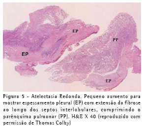 Atelectasia redondaA atelectasia redonda é uma rara complicação de doença pleural asbesto induzida.(2,7,20) É determinada por cicatrização e fusão dos folhetos parietal e visceral, que resultam na invaginação da pleura e aprisionamento do pulmão adjacente, conduzindo à atelectasia (Figura 5). O resultado é a formação de uma massa pseudotumoral, cuja tomografia computadorizada demonstra continuidade entre as áreas de espessamento pleural difuso, evidências de perda de volume no pulmão adjacente, ou a característica "cauda de cometa" de vasos e brônquios entrando em uma massa bem delimitada. A localização do processo envolve os segmentos inferior e posterior, e podem-se encontrar lesões múltiplas em um terço dos casos. Em outros casos, um derrame pleural lento pode preceder o seu aparecimento. Se a natureza benigna da lesão é duvidosa na análise radiológica, a broncoscopia ou a biópsia transparietal são necessárias para afastar a hipótese de processo neoplásico maligno.
