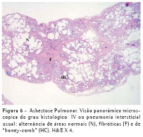 Subseqüentemente, a doença progride para envolver o ácino pulmonar, ou seja, o interstício de sustentação dos bronquíolos respiratórios, ductos e alvéolos adjacentes, sendo então classificada como fibrose intersticial graus II, III e IV(13) ou, respectivamente, fibrose intersticial graus II, III e pneumonia intersticial usual,(11) de acordo com a extensão histoanatômica de envolvimento. A fibrose intersticial grau IV(13) ou asbestose pulmonar(11) corresponde ao padrão histológico pneumonia intersticial usual - UIP, da Classificação Internacional das Pneumonias Intersticiais Idiopáticas proposta recentemente pela American Thoracic Society e European Respiratory Society.(23)