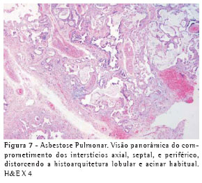 ASBESTOSE A asbestose é definida como uma fibrose intersticial difusa dos pulmões como conseqüência da exposição ao asbesto (Figura 6). As características clínicas e histopatológicas da fibrose são semelhantes a outras causas de fibrose intersticial, com exceção do achado de fibras ou CA no tecido pulmonar, em quantidades maiores que as comumente encontradas na população geral. Sua abordagem deverá ser multidisciplinar e incluir avaliação epidemiológica, clínica, radiológica, patológica e provas de função pulmonar. Na rotina diagnóstica, sobretudo para o patologista geral, há dificuldades na caracterização morfológica da doença, sobretudo pela falta de critérios padronizados à microscopia óptica e necessidade de se realizar microscopia eletrônica para contagem e identificação das fibras. A contagem do tipo e número de fibras por grama de pulmão seco, bem como a contagem do número de CA devem ser realizadas sempre que possível, pois poderão fornecer informações específicas sobre o tipo de exposição, especialmente a presença de anfibólios e sua comparação com as populações não expostas. Torna-se, portanto, imperioso o conhecimento dos padrões morfológicos de apresentação da doença pulmonar e, sobretudo, sua correlação com a radiologia.