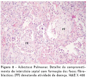 Diagnóstico final de asbestose pulmonarO diagnóstico histológico final de asbestose inclui a identificação de fibrose intersticial difusa em tecido pulmonar (Figuras 6, 7 e 8) adequadamente inflado, em locais distantes da presença de um câncer ou outras tumorações, acrescida da presença de dois ou mais CA em cortes de tecido de 1 cm2,(12-13) ou uma contagem de fibras não revestidas acima dos padrões determinados pelo laboratório em questão.(1,10)