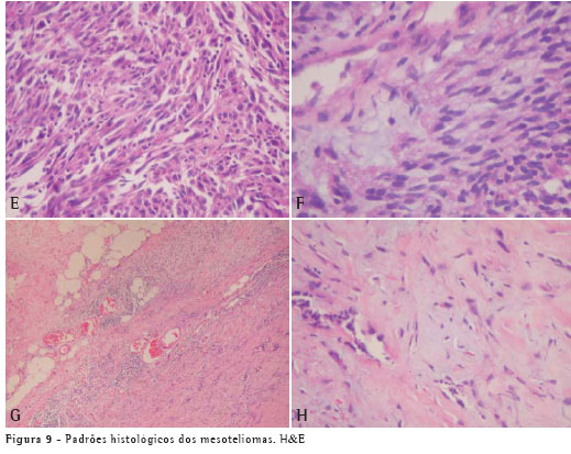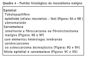 O Quadro 4 mostra um esquema para subclassificar mesoteliomas malignos pelo exame histológico.(8-9) Genericamente, podem ser divididos em epiteliais (75%), sarcomatosos (22%) e mistos (24%) .