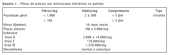 Contagem de fibras ao microscópio eletrônicoNa impossibilidade de ser efetuada de rotina, seu uso é obrigatório para o diagnóstico definitivo de asbestose pulmonar em duas situações. Na primeira, quando houver história de alta exposição durante o período crítico, e curso clínico de doença intersticial difusa, porém com padrão histopatológico não característico (por exemplo, uma granulomatose ou bronquiolite obliterante com pneumonia organizante). Na segunda, há o padrão histopatológico característico, sem a presença do corpo de asbesto, e curso clínico favorável, porém a história é de baixa exposição ocupacional ou fora do período crítico.