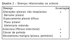 CLASSIFICAÇÃO DAS DOENÇAS RELACIONADAS AO ASBESTO No Quadro 2 estão relacionadas as principais doenças e sua associação com asbesto.(11)