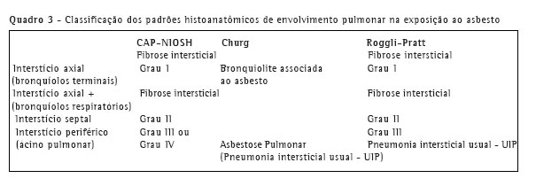 formas histoanatômicas de envolvimento pulmonar na exposição ao asbesto.(11,13,22) A fim de padronizar o diagnóstico histológico e a graduação da asbestose, em nossa rotina temos utilizado a classificação modificada do College of American Pathologists and National Institute for Ocupational Safety and Health - CAP-NIOSH,(22) preconizada por Roggli-Pratt,(13) por ser mais abrangente e levar em consideração lesões precoces e avançadas.