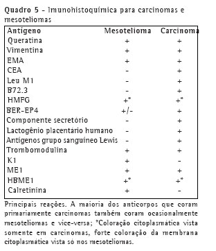 O consenso na literatura para o painel imunohistoquímico a ser utilizado para separar mesoteliomas e carcinomas é apresentado no Quadro 5. Os marcadores mais usados para carcinomas são CEA, B72.3, LeuM1, BEREP4 combinados, conferindo boa especificidade.(8-9,11) HBME1 funciona em parafina, mas cora 50% dos adenocarcinomas. Trombomodulina cora mesoteliomas e poucos carcinomas, mas é freqüente em adenocarcinomas. A calretinina cora 100% dos mesoteliomas e apenas 10% dos carcinomas em cortes de parafina. Não há uma reação imunohistoquímica definitiva para o diagnóstico e seu uso deve sempre ser valorizado à luz da apresentação histológica e macroscópica da lesão.