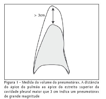 Para efeitos práticos de avaliação da magnitude do pneumotórax, recomendamos a adoção da medida da distância entre o ápice do pulmão e a extremidade apical da cavidade pleural (Figura 1). Distâncias menores ou maiores que 3 cm indicam, respectivamente, pneumotórax de pequena ou grande magnitude.(4)