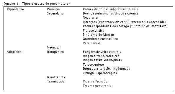 O pneumotórax pode ser classificado em espontâneo e adquirido (Quadro 1).