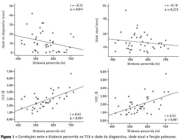 Não foram observadas correlações estatisticamente significativas entre a distância percorrida no TC6 e as seguintes variáveis: idade, IMC, DCT%, CMB%, escore clínico, escore radiológico, SpO2 em repouso, .SpO2, dispnéia ao início do TC6, dispnéia ao final do TC6, fadiga em membros inferiores ao início do TC6, fadiga em membros inferiores ao final do TC6, PImáx e PEmáx. A distância percorrida no TC6 se correlacionou significativamente com as seguintes variáveis: idade de diagnóstico, VEF1 em litros, VEF1 em % do previsto, CVF em litros e CVF em % do previsto (Figura 1).