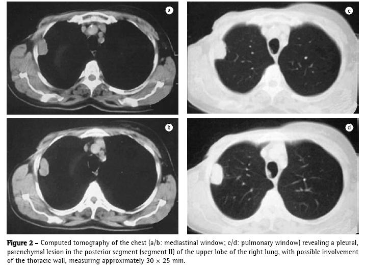 The patient then underwent computed tomography of the chest, which revealed a pleural, parenchymal pulmonary nodule measuring approximately 30 × 25 mm (Figure 2) in the right lung. Therefore, a hypothetical diagnosis of pulmonary metastasis of the breast carcinoma previously removed was made, and biopsy was indicated for diagnostic confirmation.