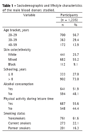 The present study was based on a previous analysis of a cross-sectional study involving blood donors and conducted between August of 1999 and January of 2000. The study sample comprised 1,235 adult male blood donors aged 20-59 years and recruited from the Cuiabá Blood Bank, located in the city of Cuiabá, Brazil. Details on the sampling process for that study have been published elsewhere.(13)