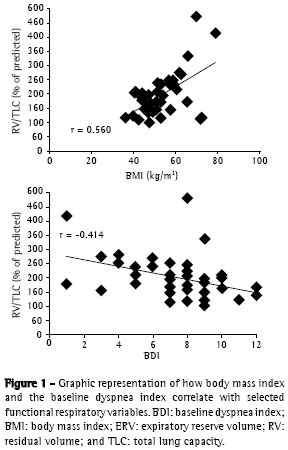 When we compared the patients divided into groups, based on the presence or absence of dyspnea, we observed that the BDI was, as expected, significantly lower in Group 1 than in Group 2. No significantly differences were detected regarding other clinical data or smoking history, although the mean BMI was considerably higher in Group 1 than in Group 2. Therefore, these factors, in isolation, do not seem to explain the occurrence of dyspnea. Regarding the functional data, mean ERV, MEP and arterial pH were significantly lower in Group 1 than in Group 2. Notwithstanding the fact that a totally acceptable explanation for the last two findings has yet to be found, the lowest value of ERV in the group that presented the most dyspnea draws our attention to the importance of this pathophysiological finding in the genesis of the symptom.