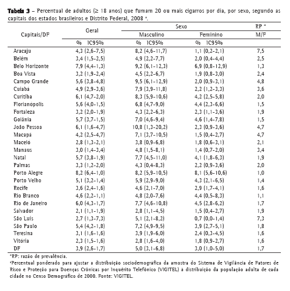A frequência de indivíduos que declararam fumar ≥ 20 cigarros/dia variou entre 2,1%, em Salvador, e 8,2%, em Porto Alegre. O consumo intenso de cigarros tendeu a ser mais comum no sexo masculino do que no sexo feminino. As cidades com maior frequência de consumo intenso de cigarro foram Porto Alegre (8,2%), Belo Horizonte (7,9%) e João Pessoa (6,1%; Tabela 3).